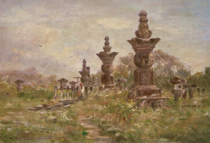 伝通院にある徳川家ゆかりの墓所を描いた油彩画。浅井らが創立した明治美術会がこの近隣にあり、同寺の境内も画題となった。