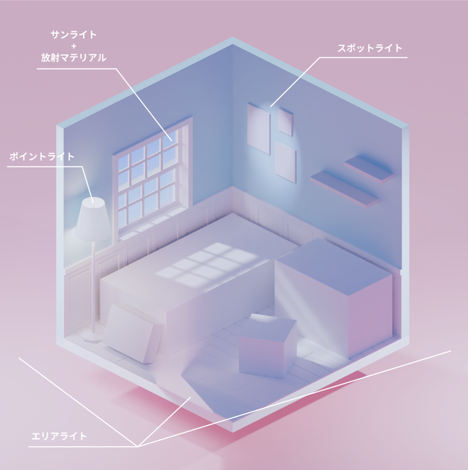 左は左で表現としてありだし個人的にどっちも結構好きです。ライトの内訳はこんな感じ。ちょっと画面がうるさいけどあえて全部の種類のライトを配置してみました。