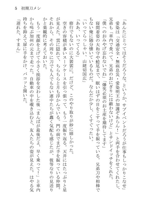 仲良し初期刀友達5振りがワイワイしている2018年現世食べ歩きの旅と、各初期刀の本丸で起きた『ごはん』の物語。刀剣男士とご飯の短編集。