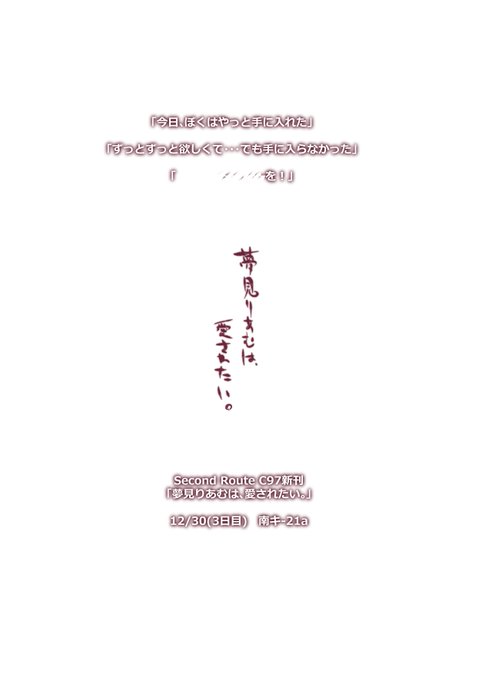 【C97】サークル「Second Route」の新刊宣伝その1です。デレステと金カムを混ぜ混ぜした本の第二弾、武内ニシパを愛でるためだけの本。尻が露出してる表紙ですが安心と信頼の全年齢向けです。