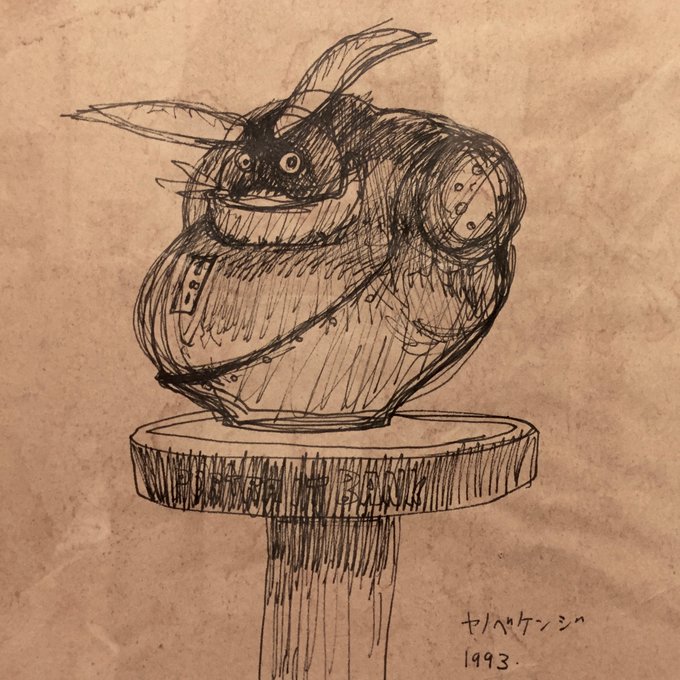 ヤノベケンジさん(見かけることはあっても面識はない)の初期20代のドローイングを持っていますが、一時期講義を担当した美術学校に数年後ヤノベさんが訪れた際にサインを残してくれたらしい。それがひょっこり出てきたということで送っていただいた。