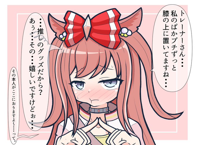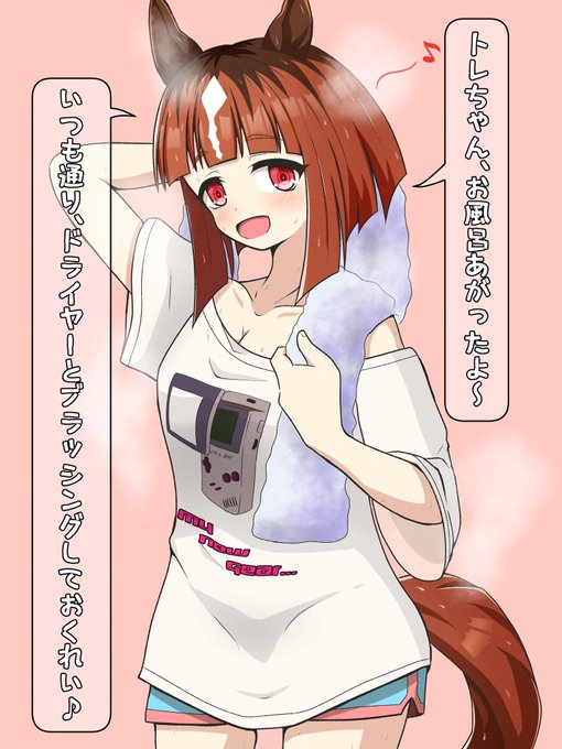 これは「遅くまでトレーナー宅でゲームとかしているうちにお風呂も頂くようになり、早くトレちゃんとゲームしたいあまり尻尾も髪も乾ききってない状態で出てきた所を見かねたトレーナーにドライヤーとブラッシングをして貰い、その心地よさに以後何度も要求してくるトラン概念」 #ウマ娘 #トランセンド