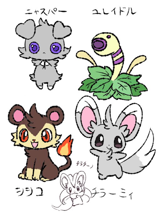 #リプ来たポケモンを資料何も見ずに描く 結果こんな感じになりました ニャスパーは7割覚えてたかな チラーミィとチラチーノはほぼバッチリ ユレイドルとシシコは原型どこいった感、、、、w リプライしてくれた皆様ありがとうございました!
