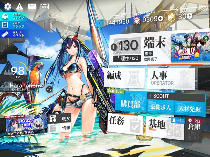 水チェン!!無料分40連目で出て申し訳ないから、2周年記念パックもお買い上げ。マドロックのコーデも買ったけど、秘書はやっぱチェンのlive2Dっ…!!#アークナイツ