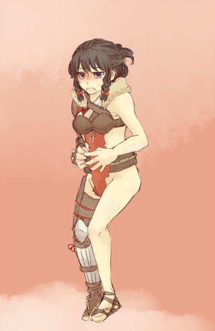 @reddr_bare エィハ服メリルさん。隠したいところだらけで、とりあえずお腹を押さえてみる。