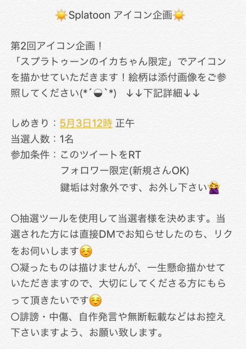 イカちゃんのアイコン描きます☺️ ⚠️添付画像をよく読んで応募下さい。 お1人様を抽選 フォロー&RTで応募完了😇 鍵垢は対象外なので外してね。 当選した人にはDM送ります✨ 締め切りは5/3 12時正午 よろしくお願いします🙇♀️ #Splatoon #アイコン企画