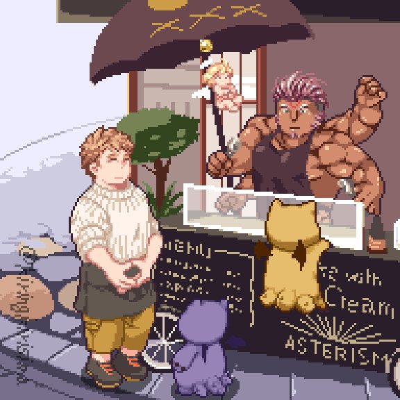 やっぱりプロキーが居ないと落ち着かない(?)ので加筆w(思ったより難しかった フラ&ゴメ「「さあ、踊りましょう!」デス!」 プロ「…いや、俺は見てるだけでいいわ」 #LIVEAHERO #ラブヒロ #ゴメイサ #フラミー #プロキー #ドット絵 #pixelart