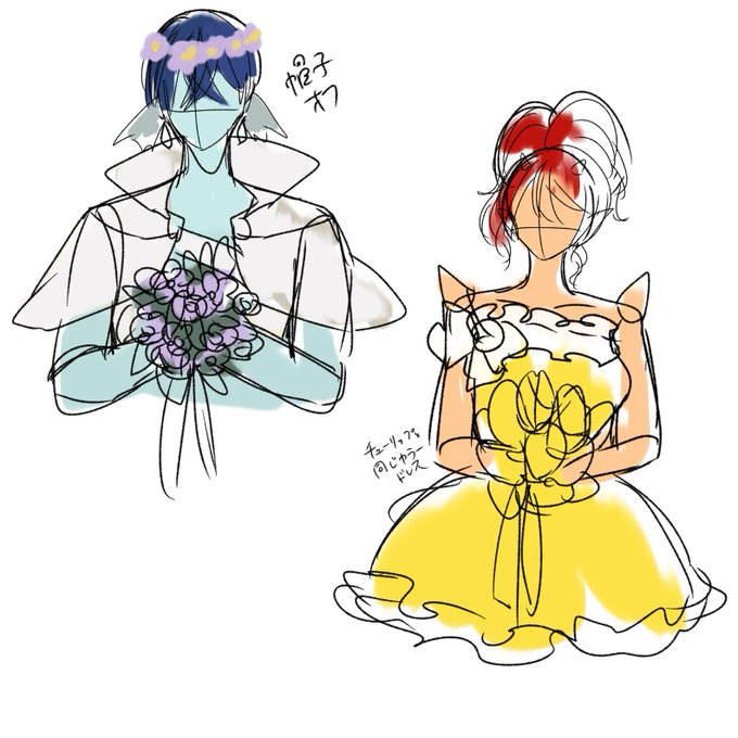 きじねこさんのだけすごいメモしてあるのは二人分一枚に収めるからなのだわ。結局黄色のドレスじゃなくて白になったのは背景に黄色のチューリップ埋め尽くしたからなんだよね。