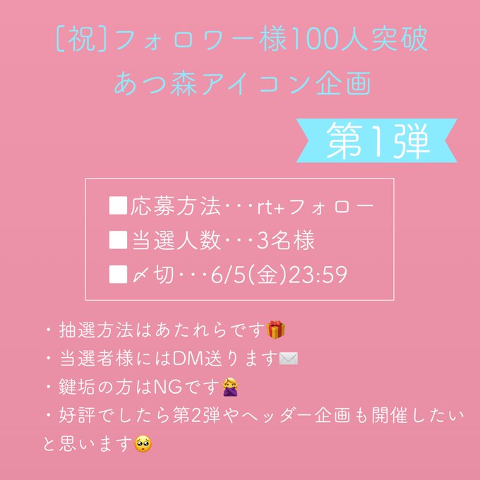 【祝フォロワー様100人突破🎉アイコン企画】 5月からあつ森垢を始めてから嬉しいことにフォロワー様が100人を突破いたしましたので初!アイコン企画開催します🥳 《応募方法》 rt+フォロー 《当選人数》 3名様 《〆切》 6/5(金)23:59まで 詳しくは画像にてご確認ください🌷 #あつ森 #アイコン企画