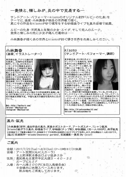 【お知らせ】7/25~8/6は名古屋・大須で小林舞香さん(@maikyarian)と合同展します!もちろん全日在廊してますので是非来てください☆ https://t.co/6Vz7fOJSjY