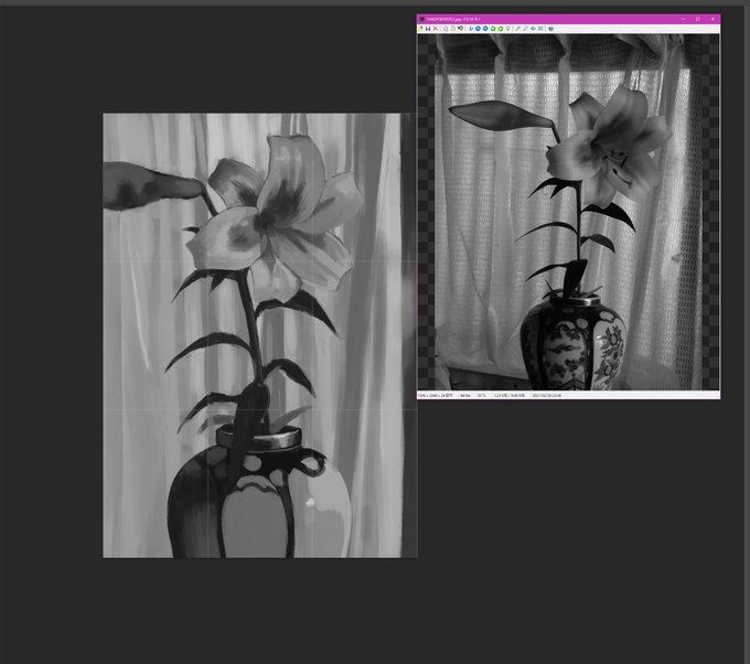 モノクロ模写その3 思ったよりなんだか全体が明るめになった 厚塗りの練習と影とかの練習になって楽しい
