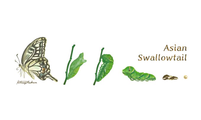 人間と一緒に描いたり、成長段階を描いたり、食草とともに描いたりしてます。
