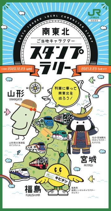 12月23日から、「南東北ご当地キャラクタースタンプラリー」を開催するよ! 各県の“主な駅”や“のってたのしい列車”内でゲットできるんだ~ 詳細はこちらをチェックしてけろな♪ https://t.co/sYER7f30zR
