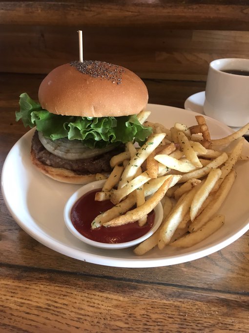 オヒルノバーガーウマウマ⭐️ シーゴト合間にハンバーガー🍔 食べたよ〜🥰 隣にいた女性たちと おしゃべりしちゃったっ🦊💓 #イラスト #ゆるいイラスト