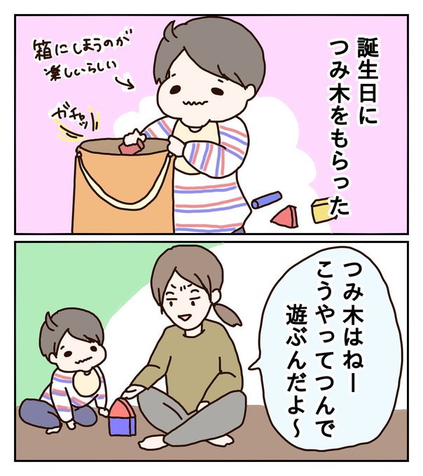おはようございます☀ つみ木は箱にしまうか 鳴らす楽器になってます今のところ 親が必死になってつんでます今のところ #育児漫画 #1歳