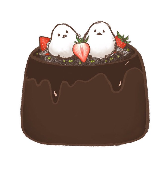 チョコレートケーキ🍫 前にiPadで描いたのを、今度は絵の具で描いてみた! たっぷりの生クリー……シマエナガ??