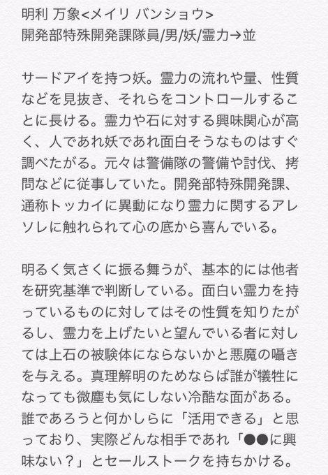 @ZAOGAKU_KABEUTI 明利 万象〈メイリ バンショウ〉 マッドサイエンティスト野郎です。 面白い霊力のにおいを嗅ぎつけてやってくるぞ!気をつけろ! 特殊開発課に入りました〜!よろしくお願いします! #ざおがく