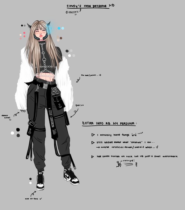@nochedraws of course u can noche!! :)) not a solid story yet however since i just revamped a new persona, her name is SIN-D, a demon android who works for a hitman organization >:D i was always appealed to those scouter things so i wanted to update my persona/oc :’)))
