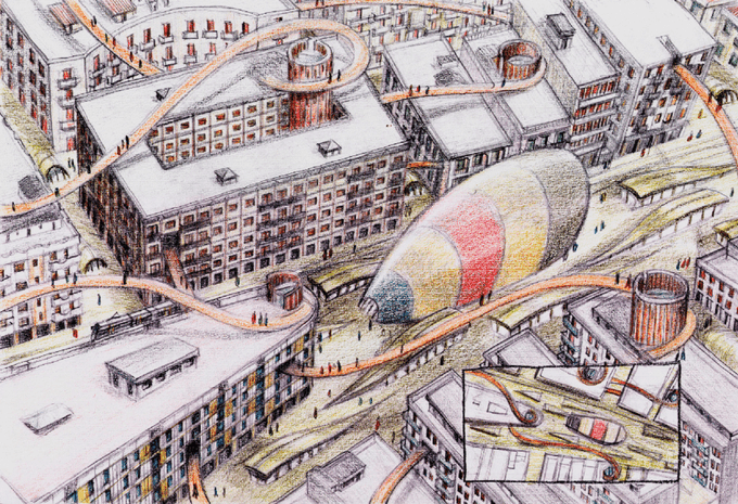 Zooming in, zooming out. | Inking my new cartoon for upcoming @arquine #91: (un)sustainable city. #architecture #cartoons #klaussketches #MakeComics