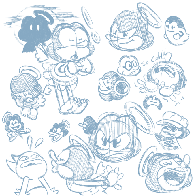 quick sketch to test different monitor proportions (i swapped houses), more B.B expressions, some more with Miss B, and finally miscellaneous tired lineart.