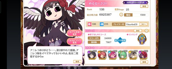 昨日は戦力値1500位記念日!闇サポート悪ほむちゃんにしたいけど、結奈さん帆奈ちゃんの並びがペア実装!?てくらいシンクロしてるから変えたくない悩み。帆奈ちゃんアニレコ出演おめでとー!