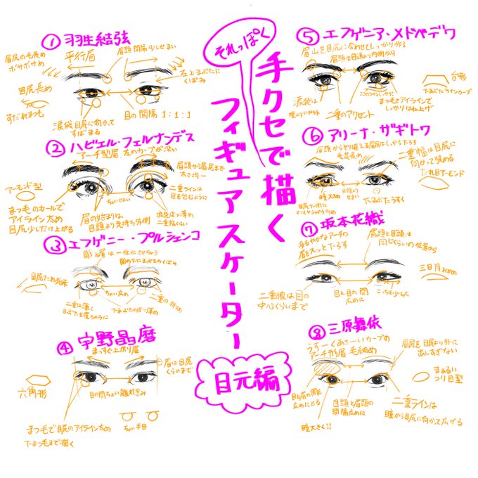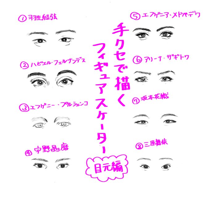 手クセで(それっぽく)描くフィギュアスケーター目元編 解説verです〜 自分用なんで合ってる合ってないは気にしない 読みたい人だけ拡大してみてね