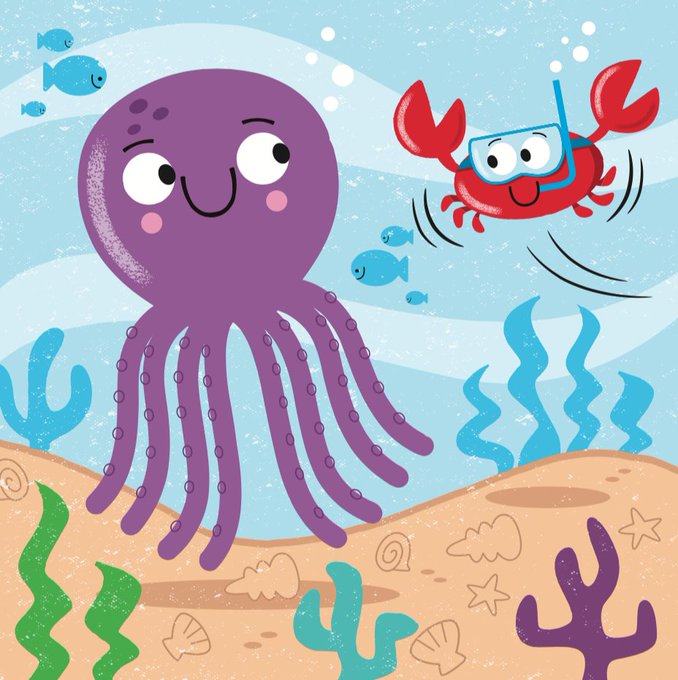 PURPLE OCTOPUS #illustration #kidsbooks #characterdesign #ocenacreatures #octopus #crab #coral #millertoons