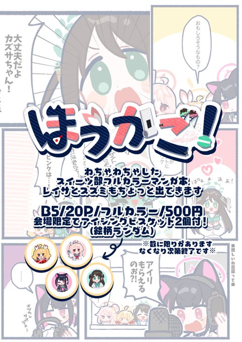 🍫せんアカ12 新刊 キャッキャしてる愉快なスイーツ部のフルカラーマンガ本です!ちょっとだけスズミレイサも出てきます! 会場限定でアイシングビスケット2個付(絵柄ランダム) B5/20P/500円 スペース ☞ ア69 ko9m02 よろしくお願いします!