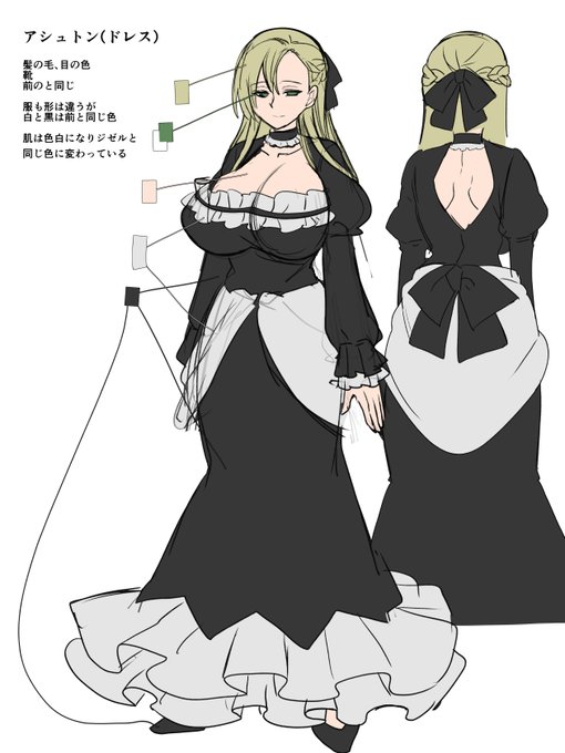 そろそろ服が変わるので設定画も描き変え ここの変化とかカラーで描いたことなかった気がする 服は段々フェミニンになりつつ黒の面積が増えるように意識してます