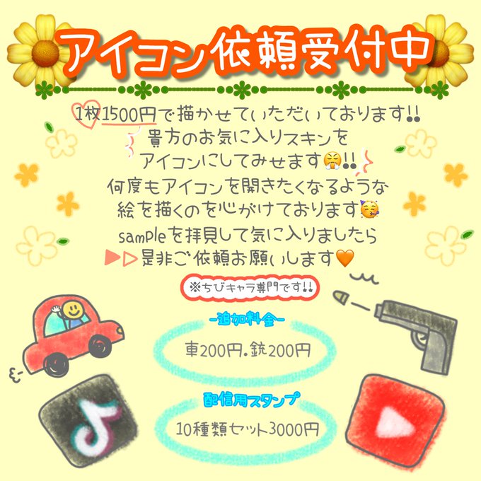 💛アイコン依頼受付中💛 貴方のお気に入りのスキンで アイコン描かせていただきます🙏 受け取った人が何度もアイコンを開きたくなるような アイコンを描くことを心がけています🥰 sampleを見て気に入ったと思った方は 是非アイコン依頼をご検討ください🥳 ※1500円で受け付けております🌼