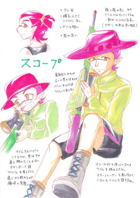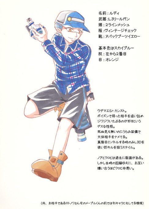 【マイイカ紹介②】肌の色は、(選択画面で左から)ライム3番目、スコープ2番目です。どうでもイイ情報付きのアナログ絵の方は割と最近描いたやつ。