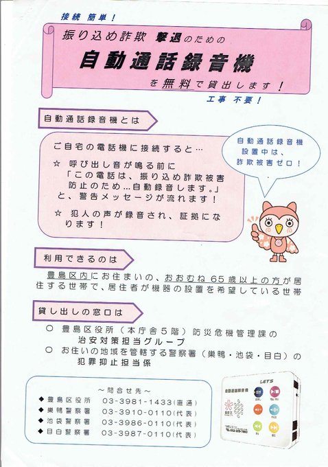 豊島区役所および警察署にて、65歳以上の区民の方を対象に自動通話録音機を貸出中です。「振り込み詐欺被害防止のため、自動録音します」と警告アナウンスが流れます。ぜひ利用してみてください。#豊島区 #池袋 #振り込め詐欺