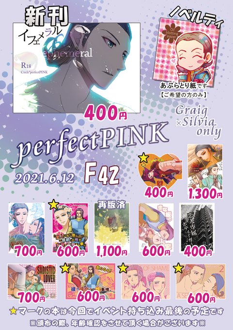 6/12はぐしる「perfectPINK F42」お品書き グレシルの小説本しかありません📕ノベルティはご希望の方のみ「ノベルティ欲しい」とおっしゃって頂ければ差し上げます🎁「Secret Garden」は3月に再版済み🌺当日は宜しくお願い致します 新刊サンプル→https://t.co/t8K9ghDGWo