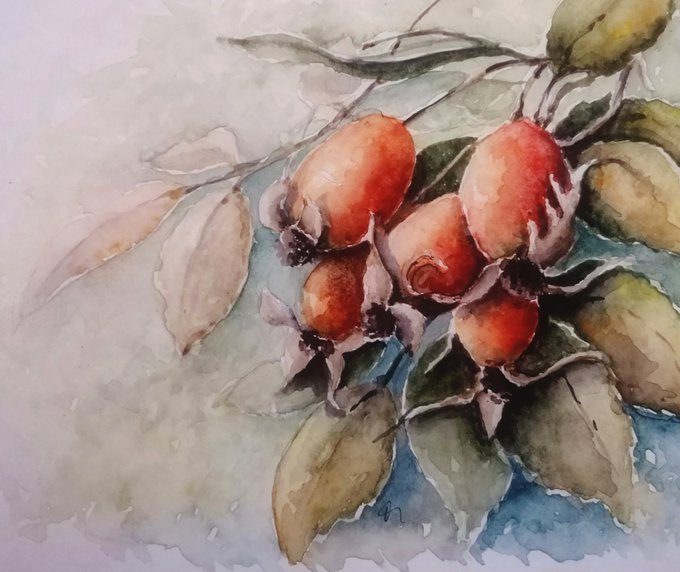 Quince and rosehip painted in watercolor.