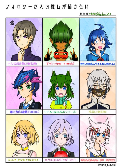 フォロワーさんの推しを描かせていただくイラストやっと形になりました……!上段と中段左の子(背景アーガイル柄)がフォロワーさんの推しです、余ったスペース(背景チェック)は自分の推しで、目と肌しか塗ってません。