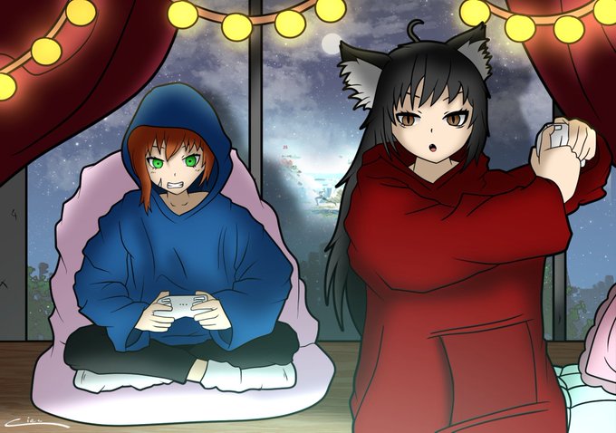 Here's my work, a cartoon/manga style with fat black lines and cool lights ❤️