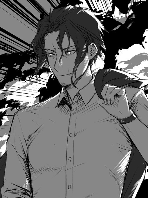 爆発を背にするおじさん。クレハさんのキャラ垂柳さん@kureha_bbt