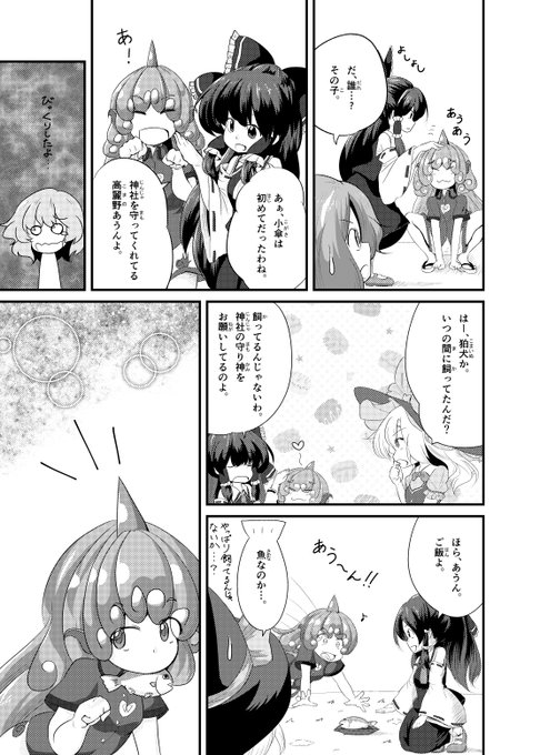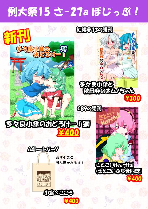 例大祭15のサンプルとお品書きです!小傘ちゃん×あうんちゃんのほのぼの系漫画になります。3枚目の霊夢があうんちゃん撫でてるコマ、キャラの高さがおかしいのはスルーして下さいw Pixivにも別ページのコマを切り抜いたサンプルを公開しているのでそちらもぜひご覧下さい☆ https://t.co/TgtlOcXj9H