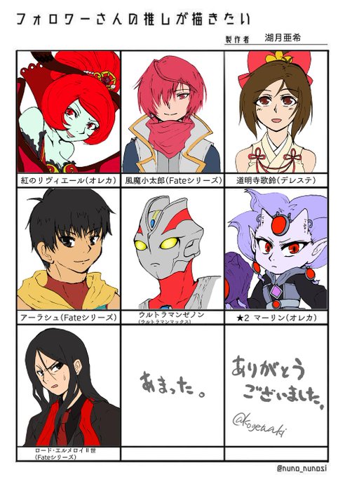 紅リヴィ様、小太郎くん、歌鈴ちゃん、アーラシュさん、ゼノンさん、★2マーリンさん、エルメロイⅡ世を描きました!