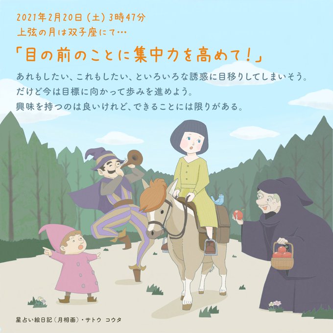 2021年2月20日(土)3時47分 #双子座 #上弦の月 #月相画 「目の前のことに集中力を高めて!」 あれもしたい、これもしたい、といろいろな誘惑に目移りしてしまいそう。だけど今は目標に向かって歩みを進めよう。 興味を持つのは良いけれど、できることには限りがある。 #占い #占星術 #イラスト https://t.co/I3Cb0A5y6z