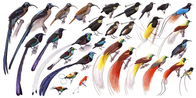 I've illustrated the birds of paradise for the New Guinea field guide (except for the crow-like Manucodes). I made a montage of all the males (proportionally scaled). This is the most incredible bird group, have seen a few species, hope for more.