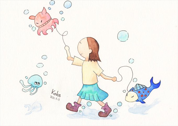 タイトルは『お散歩、おさんぽ!』、ホルベイン製透明水彩+ミリペンです。