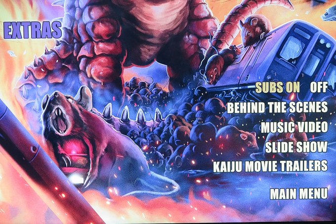 北米版「「ネズラ1964」ブルーレイの各メニュー画面と、オマケのポストカード。ポストカードはSRS cinemaから発売されている「三大怪獣グルメ」と「War of the God Monsters」のリバーシブル仕様。