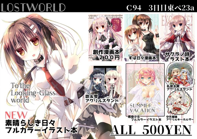 C94お品書きです。三日目ぺ23a「lostworld」でお待ちしておりますー。恒例のスケブ・色紙ポスター抽選もやりますのでお気軽にお声かけください。☆お品書き分かりにくくて申し訳ないですが、再販の創作漫画本以外は全部500円です。