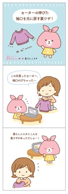 【暮らしニスタ(@kurashinista)コラボ】 暮らしニスタで見つけたお役立ちを紹介するでしゅ✨ セーターの伸びた袖口を元に戻す裏ワザでしゅ!アクリル素材のセーターに効くでしゅ🌸衣替え前にやってみてでしゅ〜! https://t.co/P1lZjnzaAr #コミミちゃん #生活の知恵