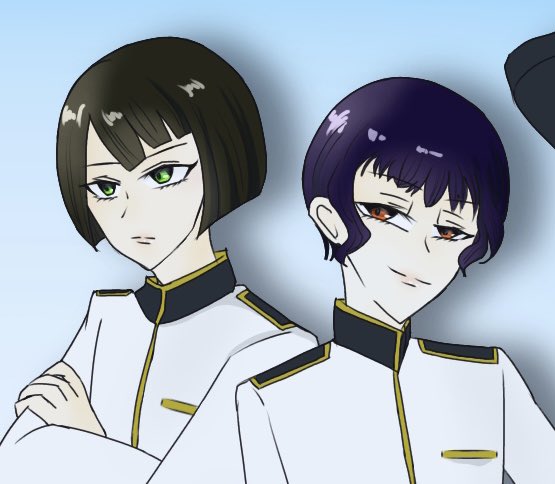@kanizousui___ では、信濃をお願いしてもよろしいでしょうか?気分で色塗りしてしまってるので分かりにくいですが、紫っぽい黒髪です😅女の子ですが、他男子達と同じズボン履いてます