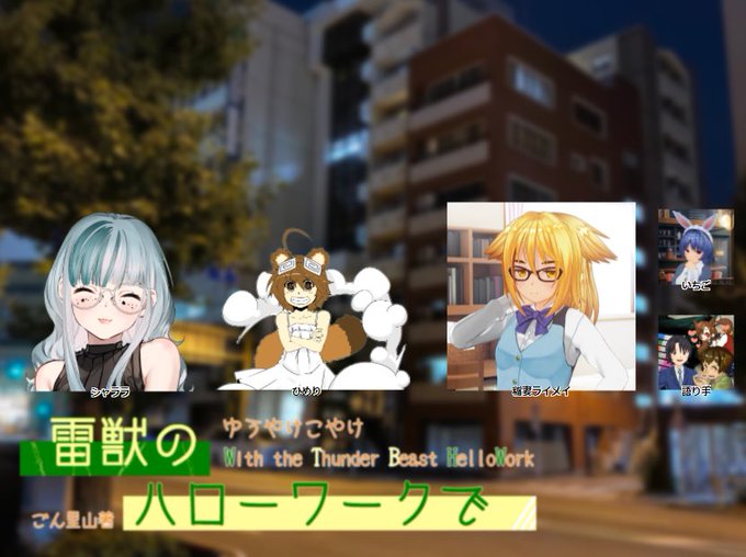 先日遊んだゆうやけこやけ『雷獣のハローワークで』の登場PC・NPCたち。俺のPCは真ん中にいる狸の女の子のひめり(イラストはeSeさん)だ。とっても楽しかったのでまた使いたいなぁ。