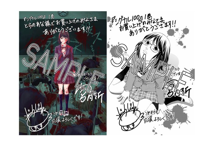 29日月曜日は「シグナル100」1巻の発売日です。お買い上げ頂くお店によって特典があります。とらのあなさまですと1話目カラー扉絵のサイン入りイラストカード,一部の書店さまで書き下ろし白黒イラストペーパーが付いています。よろしければ!