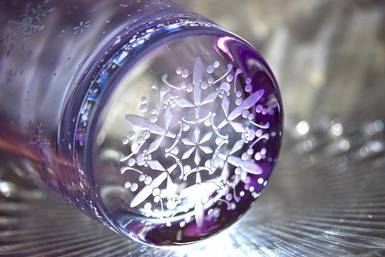 ART空さんのグラスのお迎えありがとうございます。こちらの「彩雪華」グラス・アメジストはラスト1点となりました。淡いラスター加工のシャボングラスに雪の結晶を描きサンドブラスト技法にて彫刻。底面には大きな雪の結晶を彫刻した逸品になっております。