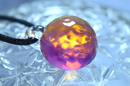 CraftWorks雲谷さんの作品のお迎えありがとうございます。こちらの水紋ガラスペンダント「オレンジストーム」1点お迎え待ちです。多数の色が合わさり、深みのある色をしています。光を当てると、オレンジとグリーンの水紋とラメが鮮やかに発色します。